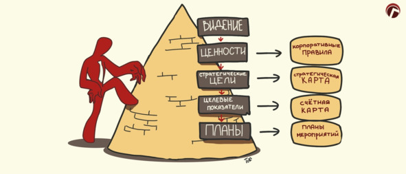 Следующий шаг: видение переводится в стратегические цели. Обычно работаю в логике системы сбалансированных показателей. Последовательно разрабатываются финансовые, маркетинговые, процессные цели. Важно определить необходимые ключевые компетенции и требования, которые необходимы для приведения персонала в стратегическое соответствие.