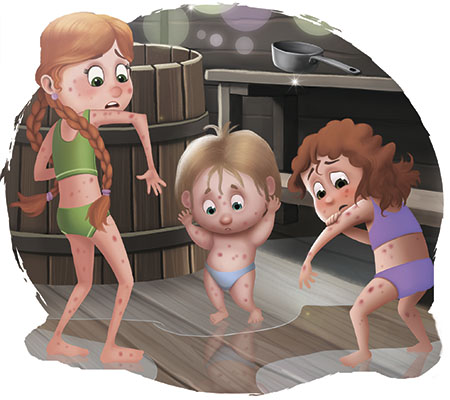 Мохнатик с ужасом остановился. Сначала руки, а затем и ноги и живот покрылись большими красными пятнами. Через несколько минут такие же пятна проявились и у детей – Анечки и Ёсика. Веничкин схватился за голову и страдальчески закрыл лицо руками. Настя запричитала: