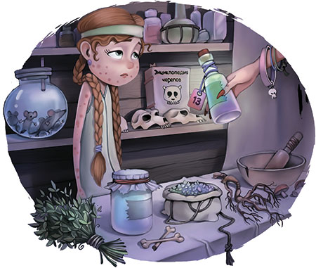 Посреди кухни на печке стоял котелок, от него исходил зелёно-синий пар. На стенах висели страшные и непонятные предметы: тут были и сухие лягушки, и мышки, когти, склянки с красным и жёлтым снадобьем, коренья, большие и маленькие черепа животных.