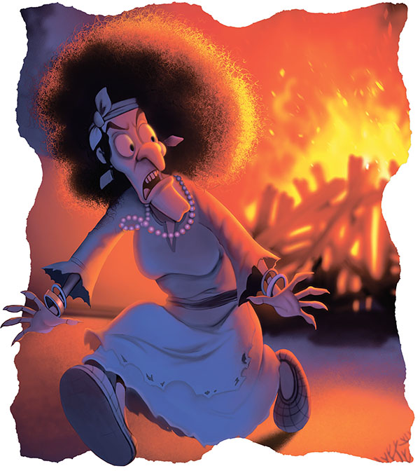 – Кто это сделал?! – не своим голосом прошипела она. В тот же миг все приглашённые ведьмы и черти затихли и остановились. Ведьма величественно подошла к кострам: – Чувствую, здесь чужим духом пахнет! Обыскать гору!