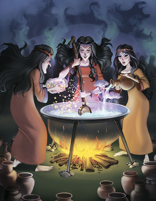 Не успели Мохнатик с Веничкиным опомниться, смотрят – ведьмы все в белые рубахи нарядились, к котлам подошли с крынками да банками и выливают туда дожди, которые с неба похитили, звёздами их заправляют для аромата. А месяц раскололи на мелкие части да по котлам раскидали. Котлы этим волшебным зельем так и засветились. Начали ведьмы с лешими хороводы водить.