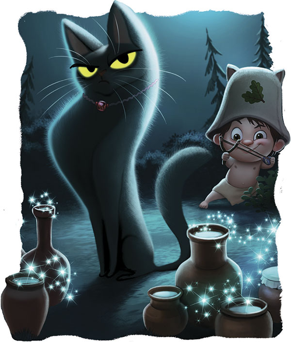 Он потёр бока и вдруг увидел, как баневёнок подкрадывается к чёрному коту. К тому самому, который, по словам Насти, был оборотнем главной ведьмы. Баневёнок спрятался за бугорком, взял камень, вставил его в рогатку, прицелился…