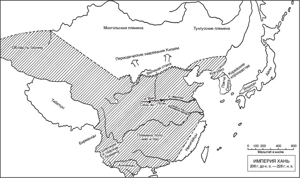 Ранние императоры Хань проявляли кипучую энергию, ведя успешную войну против кочевых племен сюнну. Они также оттеснили южноманьчжурские племена и продвинулись, обогнув Чжилийский залив, чтобы захватить Северную Корею. Хотя правители Хань не заняли Фуцзянь и Юньнань, они покорили дельту Кантона и северное побережье Вьетнама. Они проникли в Центральную Азию, торговали с Персией и в Прикаспии имели контакты с аванпостами Римской империи[17]. Хотя Хань воздерживались от тяжелого бремени общественных работ, способствовавших падению Цинь, все же они оставили после себя такой памятник, как первые 500 миль (800 км) Великого канала, по которому в их столицу в Лояне (Хэнань) доставлялся рис из хозяйств в долине Янцзы. Почти таким же триумфом строительного искусства была система дамб, контролирующая воды Желтой реки.