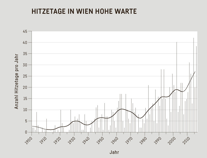 Abbildung 2-3: Hitzetage (Temperaturmaximum größer als 30 °C) pro Jahr in Wien seit 1900. Rekordwerte mit 40 Tagen wurden erstmals im Jahrtausendsommer 2003 erreicht, aber auch 2015, 2017 und 2018 kamen ähnlich viele Hitzetage vor. 4