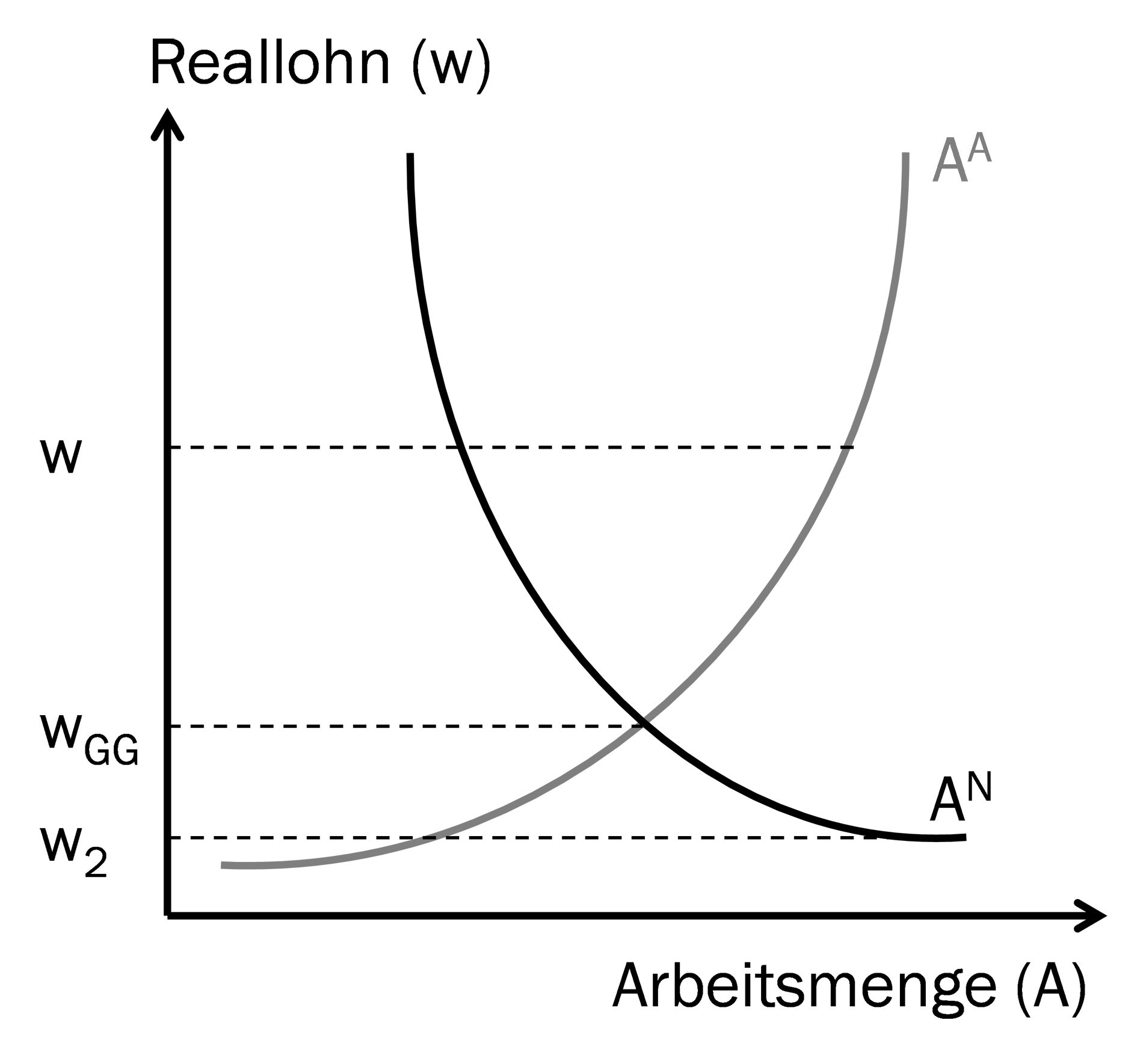 Die ansteigende Kurve des Arbeitsangebotes (AA) gibt die Hypothese wieder, dass die Arbeitskräfte mit steigendem Reallohn ihr ArbeitsangebotArbeitsangebot ausdehnen und bei sinkendem Reallohn verringern. Vernachlässigt wird dabei, dass manche Arbeitskräfte bei sinkendem Reallohn mehr Arbeit anbieten werden, um ihren Lebensstandard aufrechterhalten zu können.