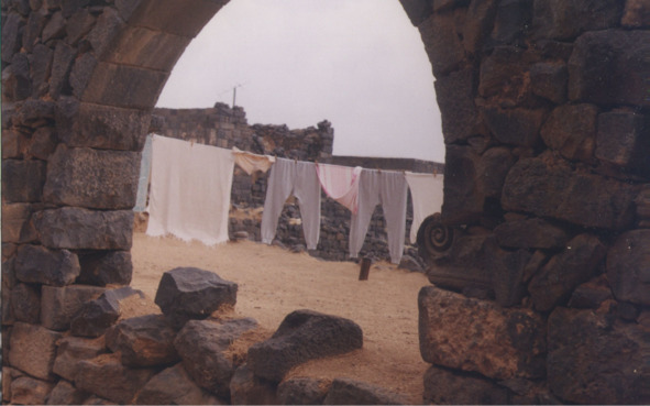 Прочие строения античной Босры (в ней, кстати, когда-то проживало более 80 тысяч человек) за истекшие столетия многократно перестраивались; камни и колонны древних зданий переносились для строительства новых. Жители и по сию пору используют тысячелетние кирпичи. Среди развалин римской эпохи, весьма протяжённых, можно встретить развешанное на верёвке бельё, можно увидеть новые двери, застеклённые окна и даже электрические провода. По римской дороге, вымощенной каменными плитами, бродят ослы и пешеходы. Люди, как могли, приспособили античную Босру к своим современным нуждам.