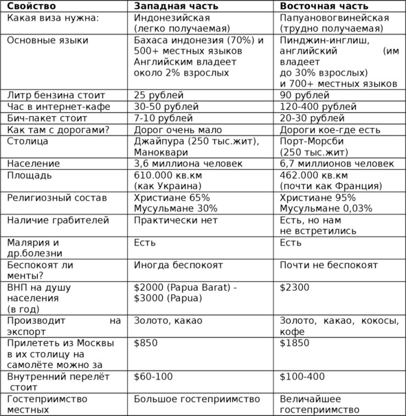 Чтобы вам было удобней понять устройство Новой Гвинеи, и понять – чего от чего ожидать, составим небольшую таблицу свойств Западной и Восточной частей острова.