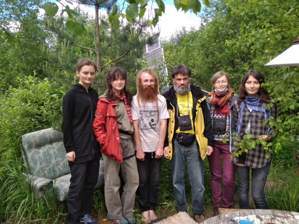 Бородатый отшельник колол дрова, растопил печку и приготовил чай, потом мы все его пили – не в землянке, на улице, среди травы, под шум трассы, вместе с утренним солнцем. Тут пожаловали ещё гости к Юрию – проезжавшие мимо муж, жена и ребёнок. Они присоединились к чаю, ребёнок разглядывал кролика, мы фотографировали друг друга и бюст какого-то древнегреческого философа – то ли Платона, то ли Сократа. Пообщались, в основном на темы политические, потом разъехались: новые гости поехали по своим делам, а мы шестеро вышли на трассу… И опять нас шестерых подобрала одна вместительная машина! Это были жители Переславля-Залесского, ехавшие в свой город.