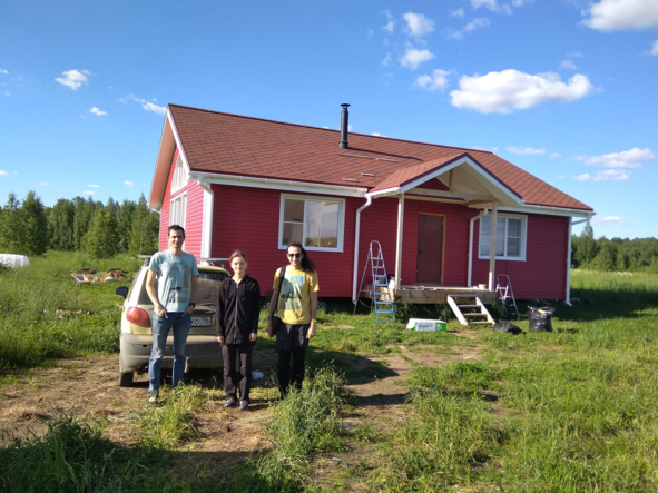 Роман год назад переехал и уже отстроился – используя деньги и платную помощь местного строителя-специалиста. И вот мы посетили его – приехали в Семибратово автостопом, а дальше Роман нас забрал оттуда на машине. Машина у него не очень большая, так что для того, чтобы привезти нас с рюкзаками, ему понадобилось два рейса.