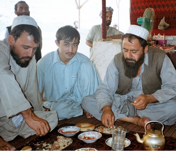 Вот торговая деревня. Три десятка осёдланных ослов стоят на ослостоянке, ожидая своих хозяев, ушедших на базар. Вдоль единственной улицы-шоссе выставлено на продажу всё: арбузы, дрова, палки и железки, помидоры диаметром два сантиметра, яблоки, газировка иранского и афганского разлива, инструменты, резиновые вёдра для воды, сколоченные гвоздями из обрезков автомобильных шин… Вот печи для изготовления лепёшек, пышущие жаром и огнём, а вот предприятие общественного питания – чайхана.