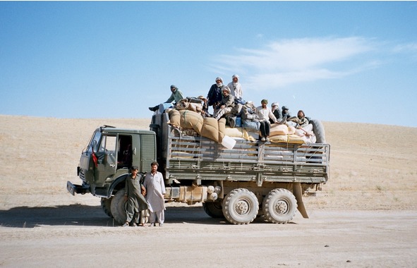 Мы идём пешком на выезд из Калай-Нау. Удивлённые местные жители указывают нам искомое шоссе. Посёлок неожиданно заканчивается; последним домом его является выездноый пост афганского ГАИ. Верёвка, протянутая поперёк дороги, преграждает путь скопившимся четырём «Камазам». Грузовики полны барахлом и людьми – это мухаджиры, переселенцы, а точнее говоря – беженцы, возвращающиеся из Ирана, где они прожили несколько лет, – к себе на родину, в одну из северных провинций Афганистана. Три грузовика полны вещами до самых бортов; наверху сидят по двадцать пять-тридцать запылённых мужчин. Один грузовик почти без вещей, зато перегружен женщинами и детьми, их там пятьдесят или шестьдесят человек. Грузовики ждут, скопившись на посту; мухаджиры, водители и гаишники с интересом разглядывают нас подходящих.