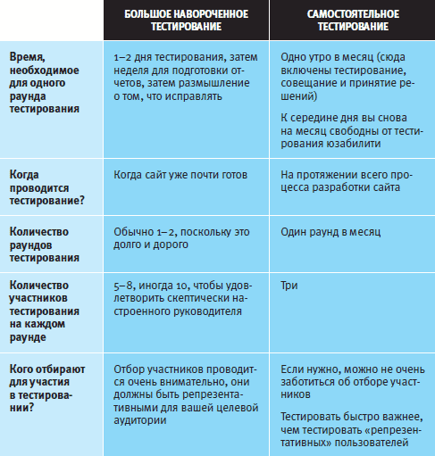 «Самостоятельному тестированию» доступно не все, что доступно Большому Навороченному тестированию, но оно достигает результатов, которые вам нужны, за ту цену, которую вы можете себе позволить. Перед вами сводная таблица различий, существующих между двумя этими типами тестирования (все элементы этой таблицы будут подробно прокомментированы в следующих главах):