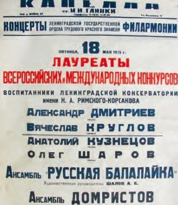 В мое время лауреатство давало право выступать не только номером, но и с сольным концертом. Но для того, чтобы поступить в концертную организацию (а в Ленинграде это «Ленконцерт»), надо было пройти худсовет. Обычно совет проходил в Театре эстрады Ленинграда, у А. Райкина. Там я встретил «цвет культуры» города. Особую поддержку при прохождении первого худсовета мне оказали выдающиеся концертмейстеры А. Люблинский и Ю. Лазько. С первым я сделал записи на радио, а со вторым играл на заседании худсовета. Состояние исполнительства на домре в городе «андреевских» традиций было таково, что когда мне предложили гастрольную поездку по стране с сольным концертом, то в гастрольном отделе «Ленконцерта» долго не верили, что на домре можно дать сольный концерт. Конечно же, было много музыкантов-домристов, выступавших номером, но сольный концерт?! Это было, на взгляд некоторых деятелей, слишком! Так началась моя многолетняя гастрольная эпопея.