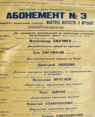В Ленинградской консерватории я застал время, когда по коридорам, устланными ковровыми дорожками, ходили Д. Шостакович и Е. Мравинский… Можно было зайти в класс И. Браудо и, остановившись ненадолго в коридоре, получить от А. Дмитриева (ученика Б. Асафьева) развернутый план диссертации. Ректором консерватории был Павел Алексеевич Серебряков. Выдающийся пианист, он был воспитан в среде того времени и поддерживал идею приобщения народных масс к музыкальному искусству. Павел Алексеевич был одним из инициаторов возрождения народной консерватории (1961) и охотно выступал с шефскими концертами. В этих сборных концертах посчастливилось выступать и мне. Я мог вблизи наблюдать искусство М. Ваймана и Б. Гутникова, певицы К. Изотовой, виолончелиста Ю. Лазько…