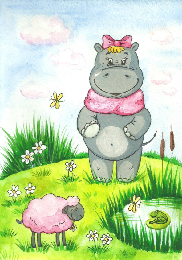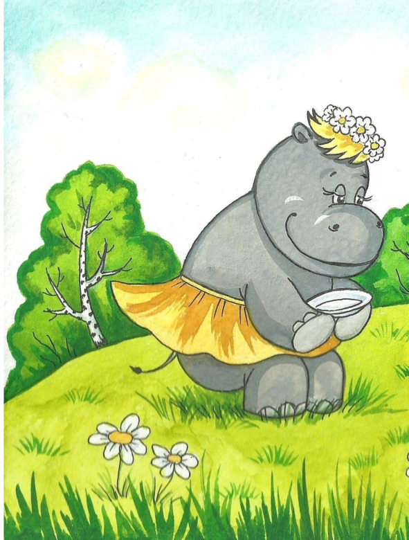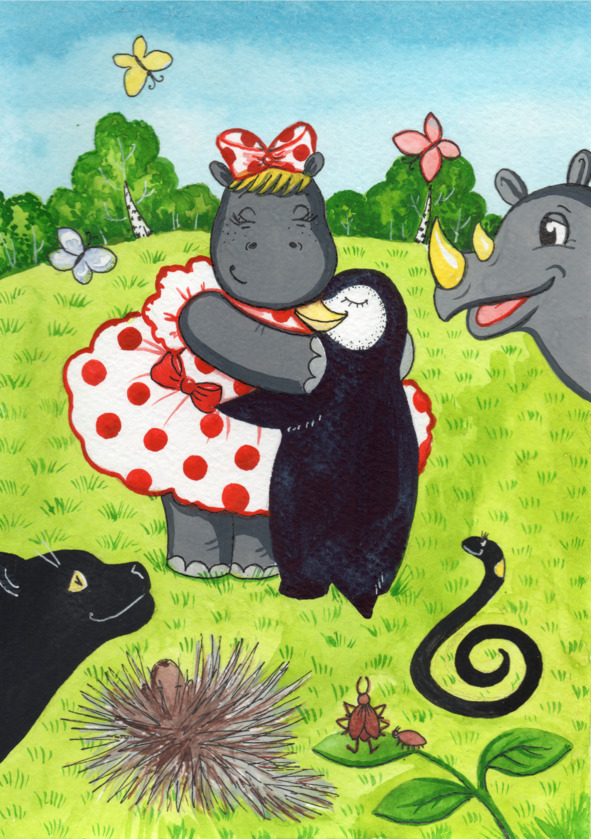 Кто сегодня в новом платьеДарит всем свои объятья?И Пингвину, и Пантере,И Енотику Валере…Самый добрый зверь в Болоти —Озорница Бегемоти!У Ужа обнимет хвост,У Слона, конечно, нос,Рог у Сэра Носорога,Лишь жуков не станет трогать…И придумает не сразу,Как обняться с Дикобразом…