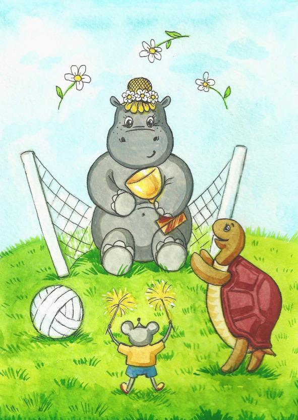 Малышка БегемотиПомешана на спорте.Сегодня физкультура.Ура! Ура! Футбол.Сказал учитель Панда:«Вставай-ка на вороти!Сегодня будет битва,Но нам не влепят гол».Малышка БегемотиПодумала мгновенье:«О Боже, на вороти?Но я не влезу в створ…Какая я глупышка…Мне нужно «на»… не «подле»».Она размяла ногиИ начала разгон…Раздавлены вороти…Учитель Панда в шоке.Ликует вся команда —Теперь не проиграть!И лишь Малышка знает —Не станет футболистом!Уж больно странный способВ футболе побеждать!Бегемоти и Мышь