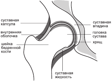 Рассмотрим строение, допустим, шаровидного тазобедренного сустава (рис. 1). Круглая головка бедренной кости расположена в вертлужной впадине тазовой кости, которая соответствует окружности головки, и это позволяет совершать разнообразные движения. В то же время устройство суставной впадины создает условия для достаточной устойчивости сустава. Его поверхности покрыты светлой, стеклообразной, эластической тканью – хрящом. Он служит амортизатором при резких и неожиданных движениях. В юности суставные поверхности идеально гладкие, скольжение в них происходит без существенного трения. Изнутри сустав покрыт синовиальной оболочкой, продуцирующей жидкость – «смазку», снижающую трение. Такие свойства придает ей гиалуроновая кислота. Синовиальная жидкость периодически обновляется, с ее помощью к суставному хрящу доставляются питательные вещества. Хрящ не содержит сосудов и нервов, поэтому выдерживает большие нагрузки без особого вреда для сустава.