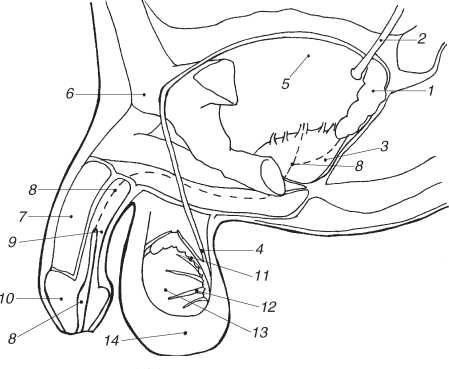1 – семенной пузырек; 2 – выводной проток; 3 – простата; 4 – семявыносящий проток; 5 – мочевой пузырь; 6 – лобковая кость (срез); 7 – кавернозное (пещеристое) тело полового члена; 8 – мочеиспускательный канал; 9 – кавернозное тело уретры; 10 – головка полового члена; 11 – придаток яичка; 12 – семенные канальцы; 13 – яичко; 14 – мошонка