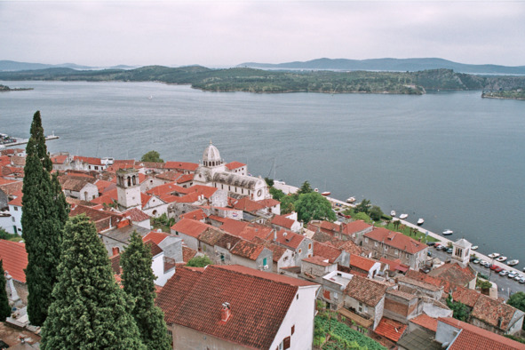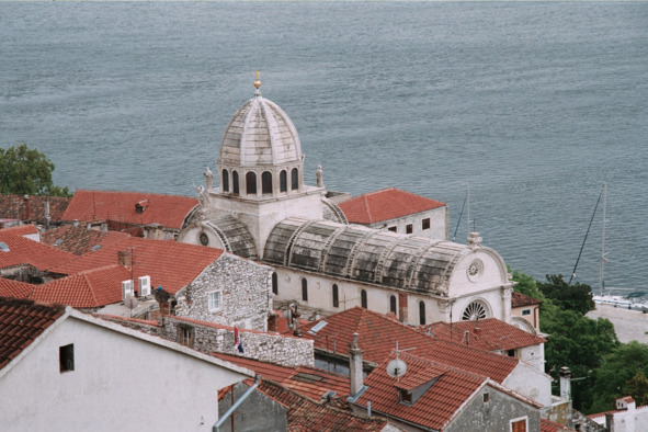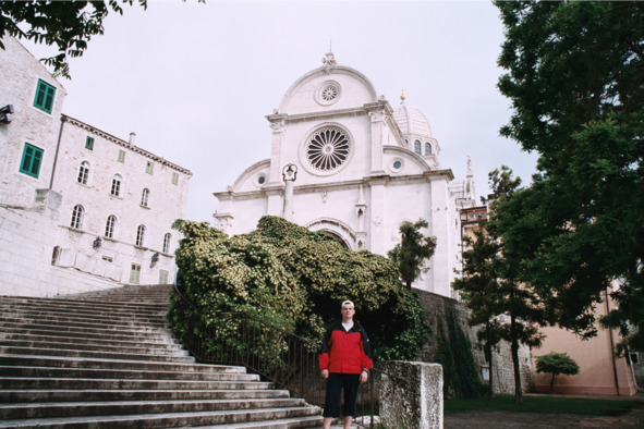 Приехав на автовокзал, я задумался, что делать дальше. С одной стороны, дождь был не такой уж и сильный. Не то что однажды в Карелии. Но, с другой стороны, я был в сандалиях, а промокнуть со всеми вытекающими из этого последствиями, особенно в начале отпуска, мне не хотелось. Поэтому я сначала справился в билетной кассе о времени отправления автобусов в национальный парк Krka (помните, куда я хотел съездить вместе с Ириной). И лишь затем, выглянув на улицу, решился все-таки прогуляться по городу, так как рядом увидел кафедральный собор Св. Якова, построенный в 1431—1536 годах и являющийся ныне памятником ЮНЕСКО. Кроме того, мне необходимо было раздобыть информацию о правилах и возможности посещения национального островного парка Kornati (Корнаты), которую мне могли предоставить только в городском турбюро, два из которых находились в этой части города.