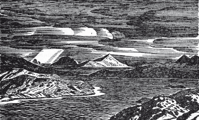 Потрудившись еще немного, путешественники добрались до торфяника, а затем и до обнаженной сланцевой породы. С вершины холма они обнаружили, что воды по его склонам текут к морю в разных направлениях. Перед ними широко открывалась окрестная местность: к северу простиралось топкое болото, зато к югу поднимался дикий величественный пейзаж, подобающий земле Блуждающих Огней. Путники застыли в изумлении, пораженные таинственным величием представшей перед ними картины: гора возвышалась за горой, вершина – за вершиной. Казалось, не будет конца этому нагромождению скалистых гор, прорезанных глубокими долинами. И все покрывал густой, темный лесной массив. Даже воздух в этом климате, где штормы с дождем, градом и мокрым снегом сменяют друг друга, казался темнее, чем повсюду в других местах. Отдалённые каналы с отвесными берегами, сетью бесчисленных ответвлений, отделяющих друг от друга острова и островки архипелага, кажутся мрачными, такими мрачными, будто ведут за пределы этого мира.
