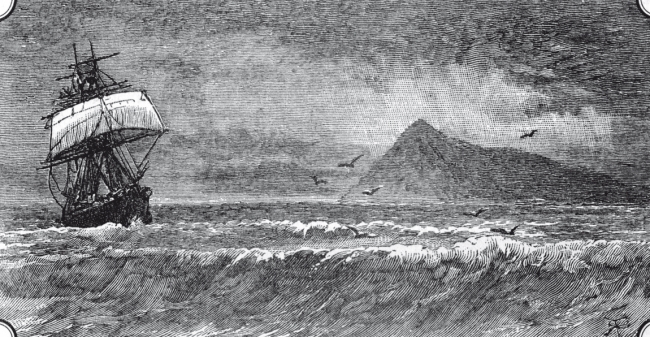 Прибой с оглушительным грохотом разбивался о берег, и брызги летали над утесами, достигавшими семидесяти метров. Чрезвычайно неприятно было слышать, как Штурман, выдавая свое беспокойство, постоянно говорил матросам: «Смотри хорошенько подветренную сторону». Буря бушевала со всей яростью; видимость была ограничена сплошной завесой брызг, поднимавшихся ветром. Море имело зловещий вид – точно мрачная волнующаяся равнина с пятнами наметанного снега.