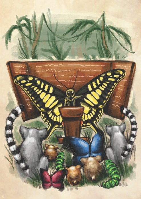 ПословицаВ демократическом Майдане существовали разнообразные объединения животных и насекомых. Среди части избирателей большой популярностью пользовалась партия мотыльков и бабочек «Я – бабочка» (ЯБК). Бабочек на острове Дадо довольно много – очень больших, очень красивых и очень необычных. У бабочки Голиафы, самой большой на планете, размах крыльев составляет 35 сантиметров, а бабочка Урания, переливающаяся всеми цветами радуги, считается самой красивой в мире. Бабочки острова Дадо не только красивы, но и наделены несомненным пониманием прекрасного в природе и гармонии в общественной жизни. Они часто объясняли жителям острова, как должно быть устроено настоящее демократическое общество. Их лидером был Махаон – очень обаятельная и солидная бабочка. Летал Махаон неторопливо, а говорил нежно и певуче.