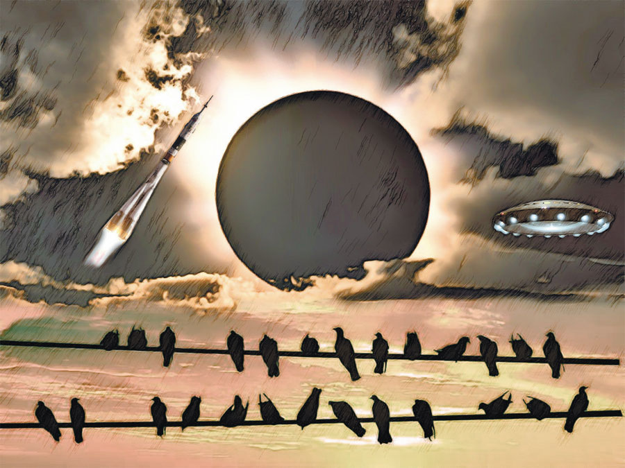 Хмурые облака раздвинулись, открыв утреннее Солнце с откусанным правым краем. Темное пятно на глазах росло, отъедая все новые куски желтого небесного сыра, птицы замолчали, и целое море человеческих лиц в ожидании обратилось к небу. Два пацаненка из соседнего двора мгновенно приобрели популярность, расхаживая в толпе и раздавая старые CD-диски, позволявшие без специальных очков смотреть на уменьшающуюся часть солнечного круга.