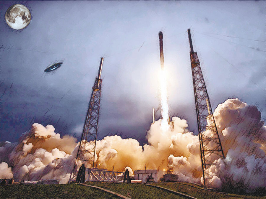 Вечер, еще светло. Но Луна уже выглядывает, просвечивает сквозь голубой флер неба. Она хочет посмотреть на закат дневного светила или, может быть, ей интересно взглянуть на старт ракеты? – она ведь ждет гостей. Луна улыбается космонавтам поневоле – не робейте, ребята, добро пожаловать в гости к тетушке Луне.