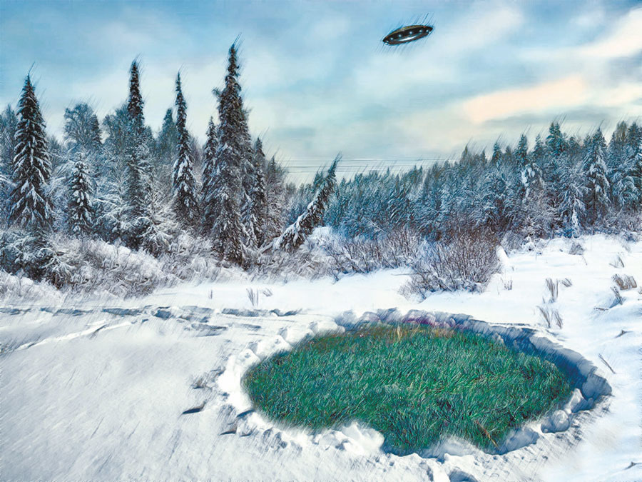 А незадолго до того были какие-то странные дела: небо светилось, электрика вся поотключалась – свет, аппаратура всякая, автомобили заглохли и трактора стали. Через несколько дней пошел – погляжу, думаю, что да как. В двух километрах отседа на лесной поляне круг нашел, а там-то… средь зимы снег растаял и трава зеленая. А к кругу следы ведут, нормальные человеческие и другие – тоже как бы человеческие, но очень уж маленькие, вроде бы детские, и рисунок от подошв необычный, кружки с диагональкой – типа дорожного знака «стоянка запрещена».