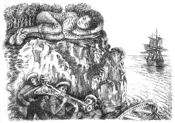 Очень осторожно вытащили они из-за пазухи великана огромный пистолет. И, сгибаясь под его тяжестью, понесли к берегу. Через каждые два-три шага они останавливались, замирали и с беспокойством оглядывались на спящего. Сопит – значит можно пройти еще немного. Бесшумно, как тени, спустились они по скалистой тропе, погрузили пистолет в шлюпку, отчалили от берега. И тут началась настоящая морская работа. Весла сгибались от усилий крепких матросов, уключины скрипели – скорей, скорей, подальше от этого острова, подальше от могучего, злого и вспыльчивого великана! Шлюпка так и летела, подгоняемая дружными гребками моряков.