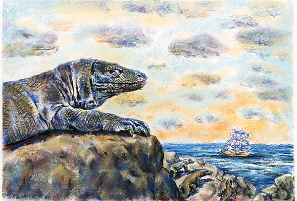 – Это остров Варанов. Здесь водятся очень большие ящерицы, длиной три, а некоторые – даже пять метров. Они такие сильные, что могут справиться с любым зверем. И если варан нападает на лошадь, то ударом хвоста валит ее на землю, а если кусает ее за ногу, одним движением челюсти перекусывает лошадиную ногу. Это очень опасное животное.