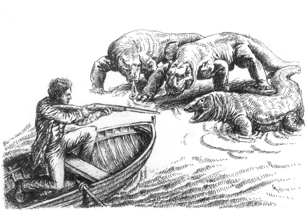 В этот момент вараны проснулись и увидели, что капитан Александр гребет в сторону от берега. Они помчались вслед за ним, крича наперебой: «Остановись, остановись, все равно мы тебя догоним!». Рассвирепевшие ящерицы плюхнулись в воду и поплыли, пытаясь схватить лодку зубами. Тогда капитан Александр встал во весь свой высокий рост, взял винтовку в руки, прицелился и выстрелил из своей подружки прямо в голову варана, который плыл первым. Тот тут же пошел ко дну. Вараны остановились, а капитан Александр сказал: