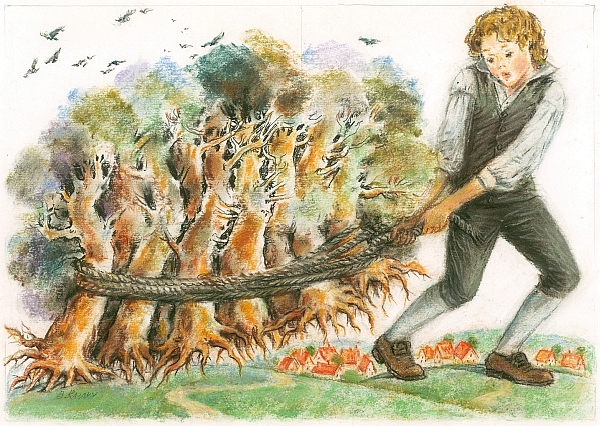 Они дошли до леса, великан Добряк охватил канатом участок леса и сделал петлю. Потом убедился, что она хорошо закреплена, потянул сильнее, канат стал сжимать деревья, и, пока петля стягивалась, все деревья, которые находились внутри, вырывались с корнем и зажимались в одну колоссальную охапку.