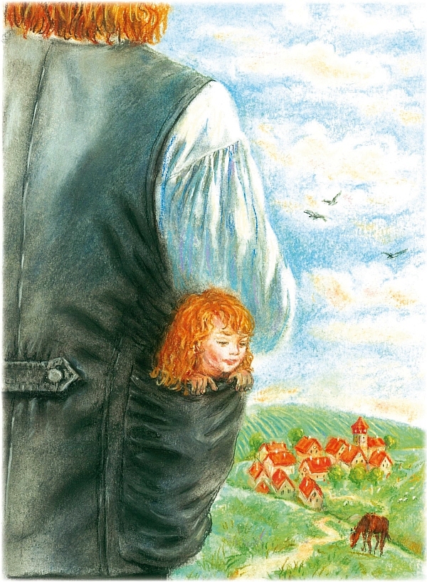 Вот Добряк положил девочку в свой карман и пошел к городу. Девочка из кармана с большой высоты смотрела вниз на луга, на реки, озера, на громадную собаку, которая шла рядом с Добряком, собаку, которую звали Черная гора. Наконец, они пришли в город. Добряк нашел дом, где жили родители девочки, заглянул в окно. Вначале те испугались, увидев огромное лицо, но потом поняли, что это великан Добряк. Они открыли окно. Добряк вынул из кармана девочку Машу и поставил её на подоконник. Та спрыгнула на пол, и родители принялись обнимать ее и целовать.