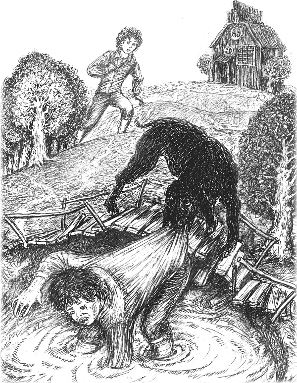 Вот Добряк сделал ров с водой и мостик. Это еще больше рассердило Злючку. Он дожидался подходящего момента, когда мостик не был поднят, перебирался по нему и вытворял какое-нибудь очередное безобразие. Тогда Добряк придумал, как прекратить эти выходки. Он подпилил доски мостика, но положил их так, чтобы это было незаметно, а сам, вместе с Черной горой, спрятался в доме. Наступил вечер, стемнело – как раз то время, когда обычно великан Злючка начинал хулиганить. Свет в доме выключен. Злючка решил, что великан Добряк с Черной горой или гуляют, или спят. Он тихо-о-о-нечко подкрался и… осторожно ступил ногой на мостик. В ту же секунду доски под ним рухнули, и со стра-а-а-шным грохотом Злючка полетел прямо в ров, в воду. Из дома с лаем выскочила Черная гора и бросилась на непрошеного гостя. Злючка очень испугался и закричал: