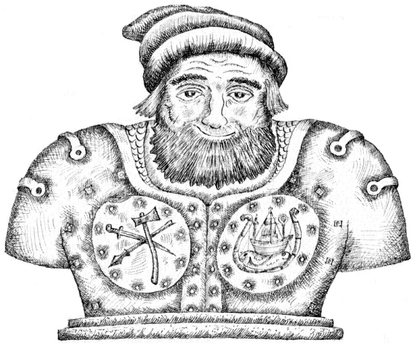 Летсер подарил Гермеку панцирь с мишенями (бляшками). На бляшках герб Мории изображён: два кита, на спинах которых стоит корабль дураков в виде испанской каравеллы, у которой не отличишь нос от кормы. На корабле, с левой стороны, – скипетр, символ земной власти, с правой – зерцало, прозрачная сфера архангела Михаила, символ предначертания и предвидения, атрибут власти Священной Римской империи, символ небесной власти, дарованной Богом.