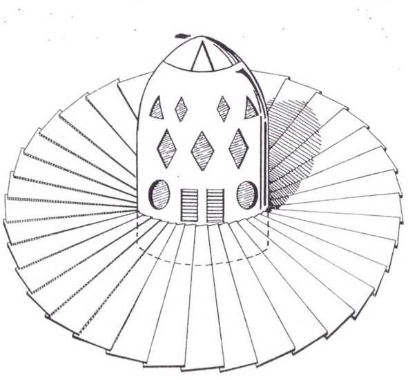 А теперь дополню свое описание НЛО. Размах его «лепестков» составлял метров 15 – 19. Яйцеобразный аппарат высотой 8 – 10 метров, наружный диаметр около семи метров, а внутренний – примерно три. Между наружной и внутренней стенками вмонтировано различное оборудование и, возможно, там же находятся и комнаты отдыха.