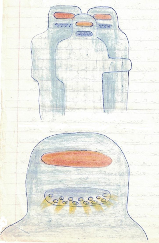 На уровне рта я увидел два ряда дырочек диаметром 7—8 см, а на уровне глаз – диск толщиной 4—5 см. Он двигался, словно парил, и горел малиновым светом, как раскалённое железо. Сантиметрах в десяти над головой струился туман. Я посмотрел на уровень рта и как бы встретился с «ними» взглядом. Из отверстий шёл желтый свет и пробивался сквозь туман. Увидел диск стального цвета, диаметром миллиметров двести, и два ряда иллюминаторов. В нижнем ряду стояло три-четыре чёрных существа высотой пять миллиметров. Формой они напоминали людей, но были очень гибкие, двигались, словно в воде. Они смотрели на меня сквозь верхний ряд иллюминаторов. Я увидел, как там быстро пробежал маленький человечек…