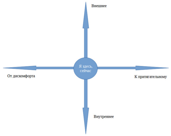 В квадранте движения «От» и «Внутреннего» мы отметим мысли, чувства и ощущения, которые нас цепляют, вызывают дискомфорт в ситуации, которой мы ощущаем застревание.