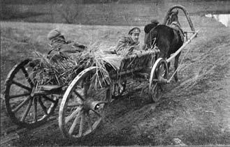 Раненые русские солдаты в телеге на пути к госпиталю. Октябрь 1914. Польша
