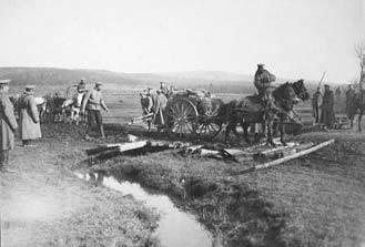 Солдаты за перевозкой полкового имущества в повозках. Октябрь 1914. Польша