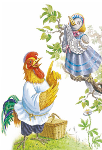 «Как, милый Петушок, поёшь ты громко, важно!» — «А ты, Кукушечка, мой свет, Как тянешь плавно и протяжно:Во всём лесу у нас такой певицы нет!» —«Тебя, мой куманёк, век слушать я готова».— «А ты, красавица, божусь,Лишь только замолчишь, то жду я, не дождусь, Чтоб начала́ ты снова… Отколь такой берётся голосок? И чист, и нежен, и высок!..Да вы уж родом так: собою невелички, А песни, что твой соловей!» —«Спасибо, кум; зато, по совести моей,Поёшь ты лучше райской птички,На всех ссылаюсь в этом я».Тут Воробей, случась, примолвил им: «Друзья! Хоть вы охрипнете, хваля друг дружку,— Всё ваша музыка плоха!..» За что́ же, не боясь греха, Кукушка хвалит Петуха?За то, что хвалит он Кукушку.