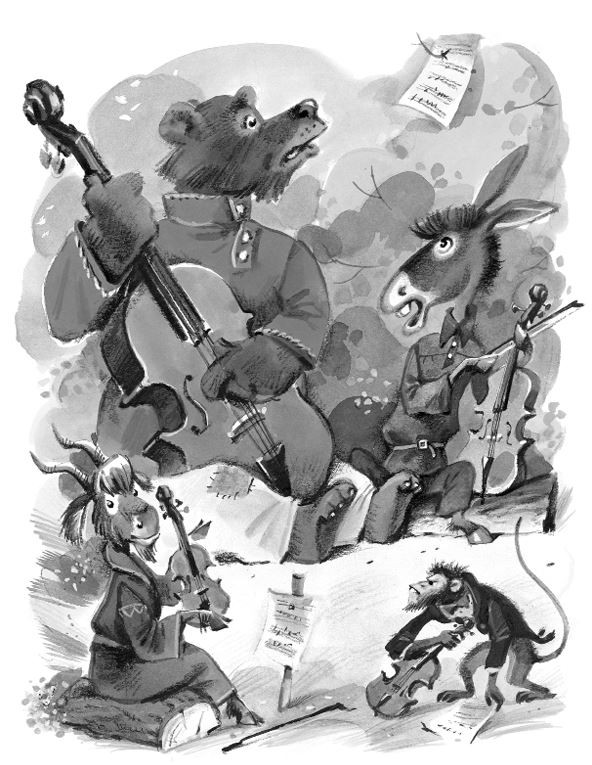 Проказница-Мартышка, Осёл, Козёл, Да косолапый Мишка Затеяли сыграть Квартет.Достали нот, баса, альта, две скрипкиИ сели на лужок под липки, —Пленять своим искусством свет.Ударили в смычки, дерут, а толку нет.«Стой, братцы, стой! – кричит Мартышка. — Погодите!Как музыке идти? Ведь вы не так сидите.