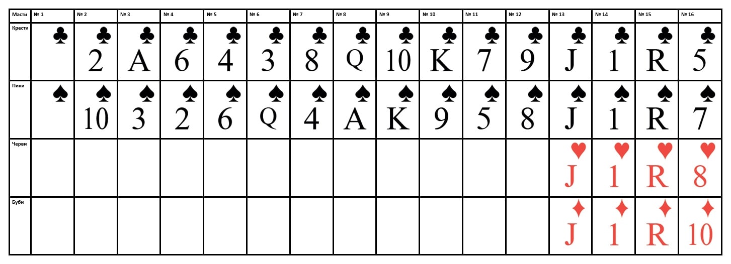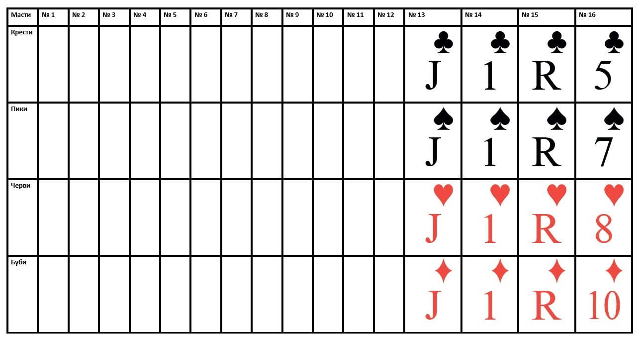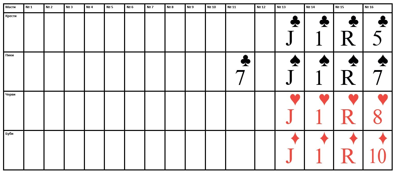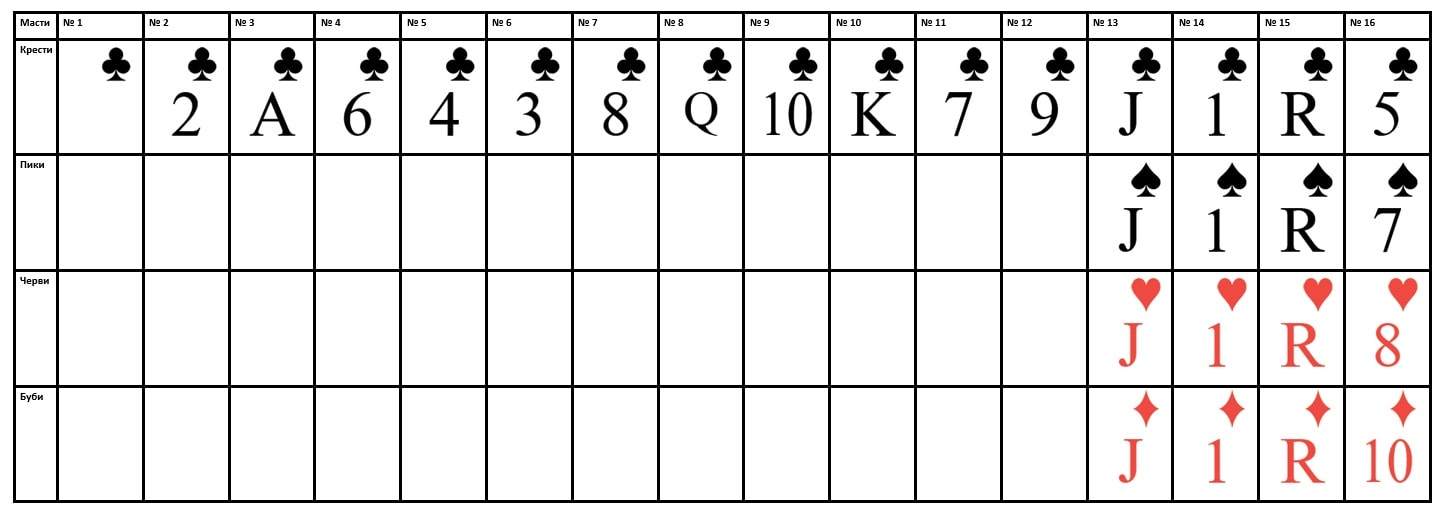 Не забывайте размещать карты по масти в нужных строках. Масть карт в строке определяется заранее, при выборе типа раскладки и указывается в левой части таблицы.