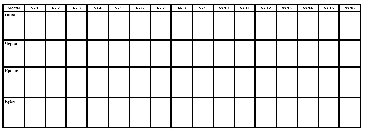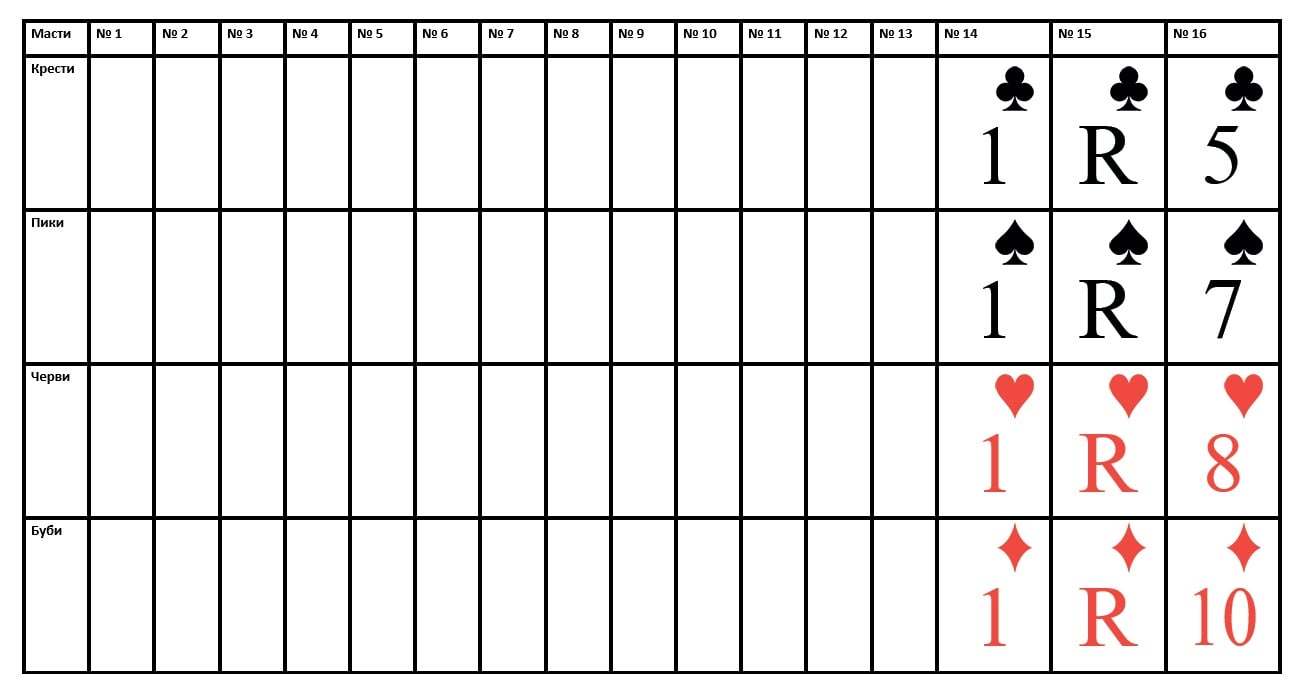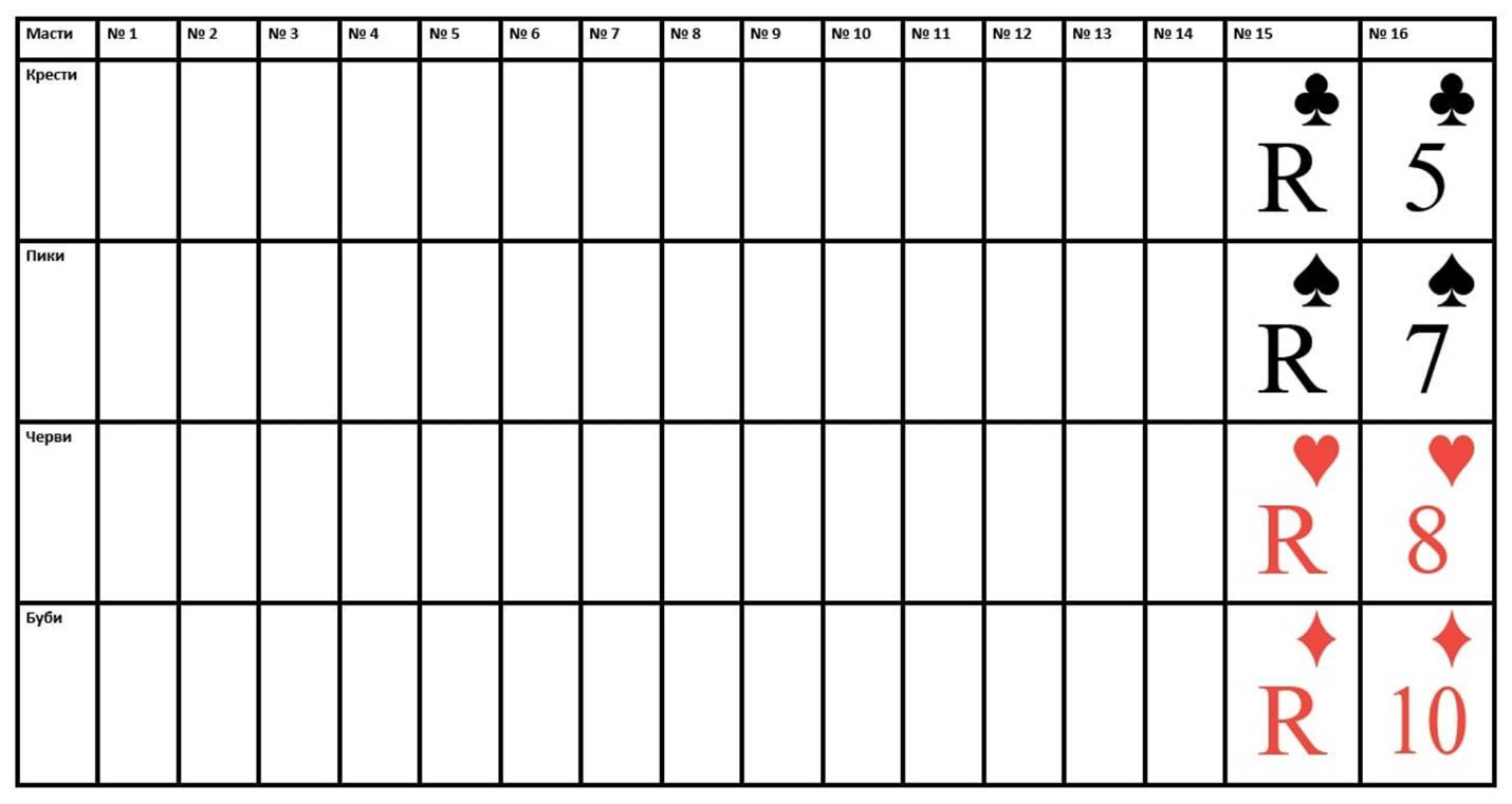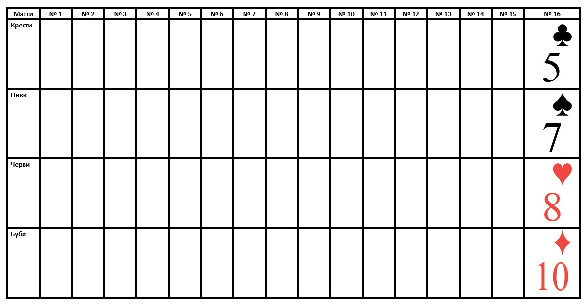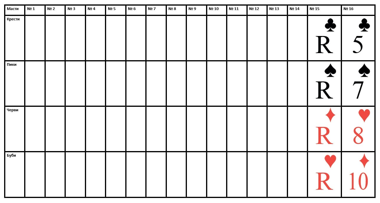Не забывайте размещать карты по масти в нужных строках. Масть карт в строке определяется заранее, при выборе типа раскладки и указывается в левой части таблицы.