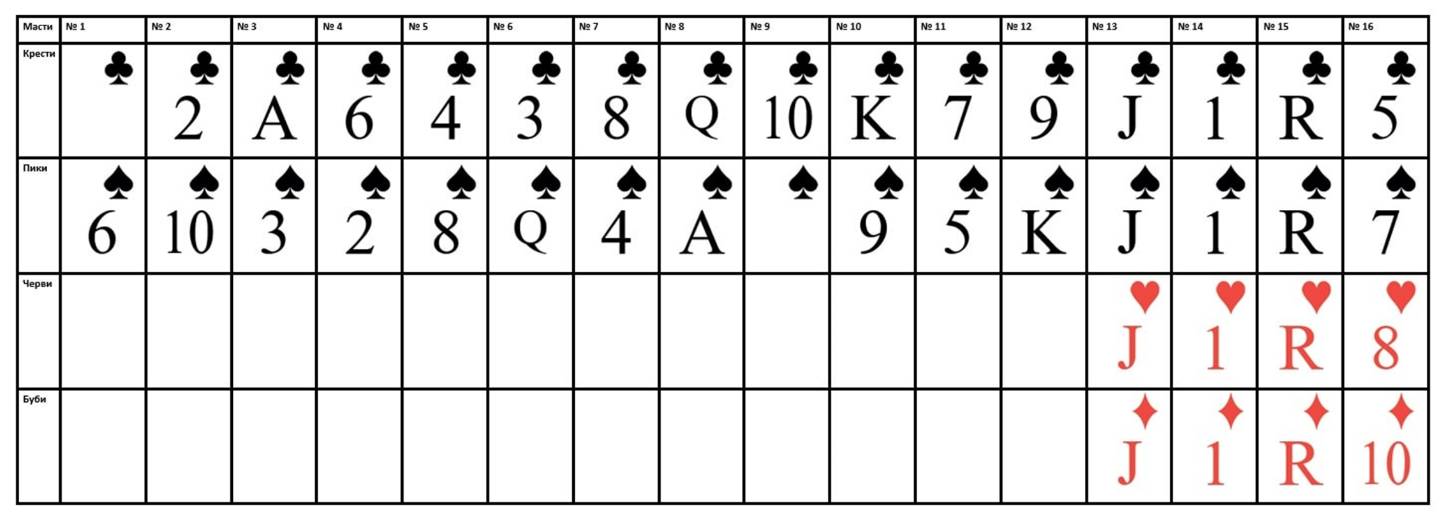 Символ масти «Крести» из первого столбца убран, для избежания путаницы с Тузом.