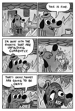 Ил. 1. Кейси Грин (KC Green). «В огне», вебкомикс из серии Gunshow, 2013. В 2014 году после публикации первых двух кадров комикса на Reddit он стал популярным мемом, а выражение «Все в порядке» (This is fine) приобрело противоположный смысл.
