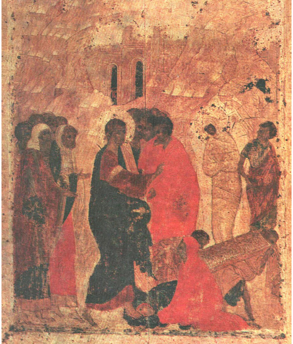 «Вначале было слово, и слово было у Бога…», — сказано в Библии. Но если Бог, согласно учению Григория Паламы, называется Светом по энергии, то и слово Бога должно обладать той же силой энергии. И действительно, яркий свет в иконе вспыхивает как раз в тот момент, когда Христос произносит слова «Лазарь, иди вон». А это значит, что по замыслу Рублёва в основе оживления Лазаря лежит энергия Божественного света, возможности которой безграничны, если она способна вдохнуть жизнь в неживое тело.