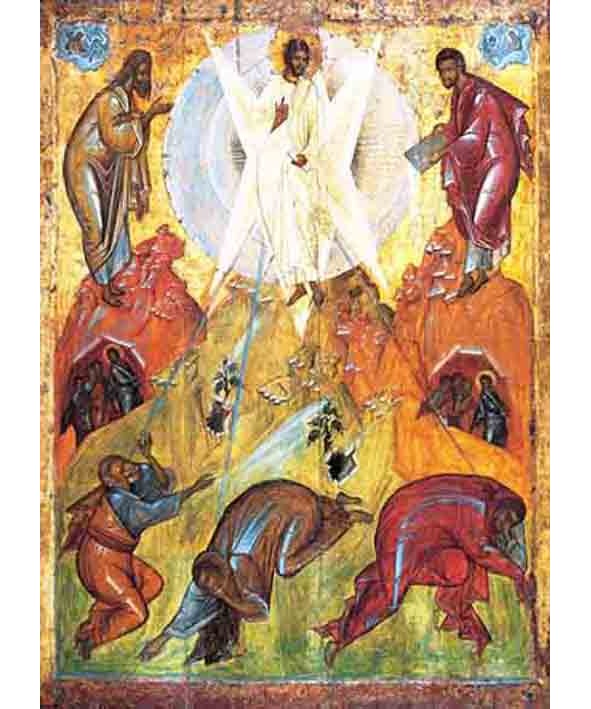 «Идущий от Христа нездешний свет образует бело-золотую звезду, замкнутую в голубой, полных золотых лучей круг… Его голубые лучи стремительно упираются в учеников – словно ими опрокинуты, они… ими ослеплены, повергнуты в изумление… В этой иконе, как справедливо сказал известный исследователь искусства М. Алпатов, «радость озарения… заглушается волнением и беспокойством свидетелей чуда». Предельно резкие позы учеников выражают потрясение от свершающегося чуда, и одновременно удивительно слито в них это потрясение с сосредоточенным покоем.