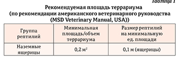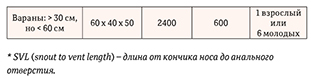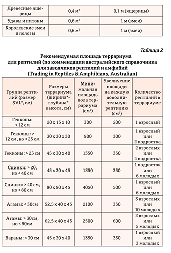 Многие виды нетребовательны к площади террариума, но тем не менее минимальная площадь для содержания пары гекконов наземного вида должна быть не менее 0,06 м2, максимальная исходя из разумных требований, – от 0,1 м2 и выше в зависимости от размеров животного и биологии вида. Для многих термофильных видов практически невозможно поддерживать разницу температур в маленьком террариуме или обеспечить локальный обогрев, потому что это может представлять опасность перегрева животных. MSD (Международная инновационная биофармацевтическая компания, известная как Merck & Co) – американское ветеринарное руководство (Divers, 2018) приводит рекомендуемые размеры террариумов для различных групп рептилий (таблица 1). Данные подаются в очень упрощенной форме, и из таблицы понятно, что при увеличении размеров рептилий необходимо увеличивать и размеры террариума. Для объективности мы представим в другой таблице (таблица 2) требования к размерам террариума для заводчиков Австралии (Walker, 2015), нарушение которых, ведет к лишению лицензии на содержание рептилий. Здесь более тщательно производится расчет соотношения размеров террариума и количества рептилий, которые могут в нем проживать. При этом прописываются размеры животных, которые могут жить на конкретной площади террариума.
